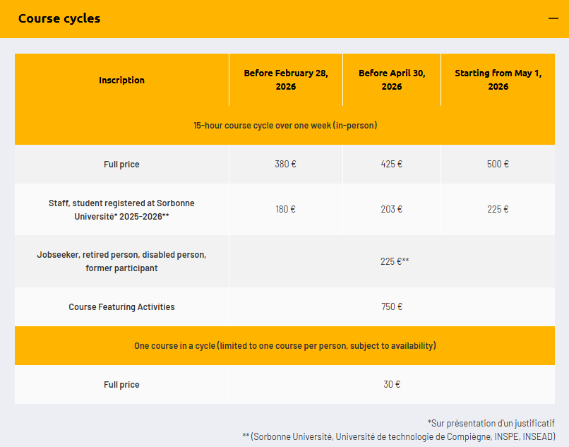 Desde el 29 de junio hasta el 24 de julio del 2026, La Sorbonne Université Paris, Francia ofrece 23 cursos multidisciplinarios, cada uno enfocado en temas clave (Historia - Literatura - Filosofía - Imaginario de Francia - París - Temas de actualidad). Algunos de estos cursos se imparten en francés, y otros en inglés. Además oferta cursos de francés: A1.1 level & A1.2 level, A2 & B1 levels y B2 & C1 levels.